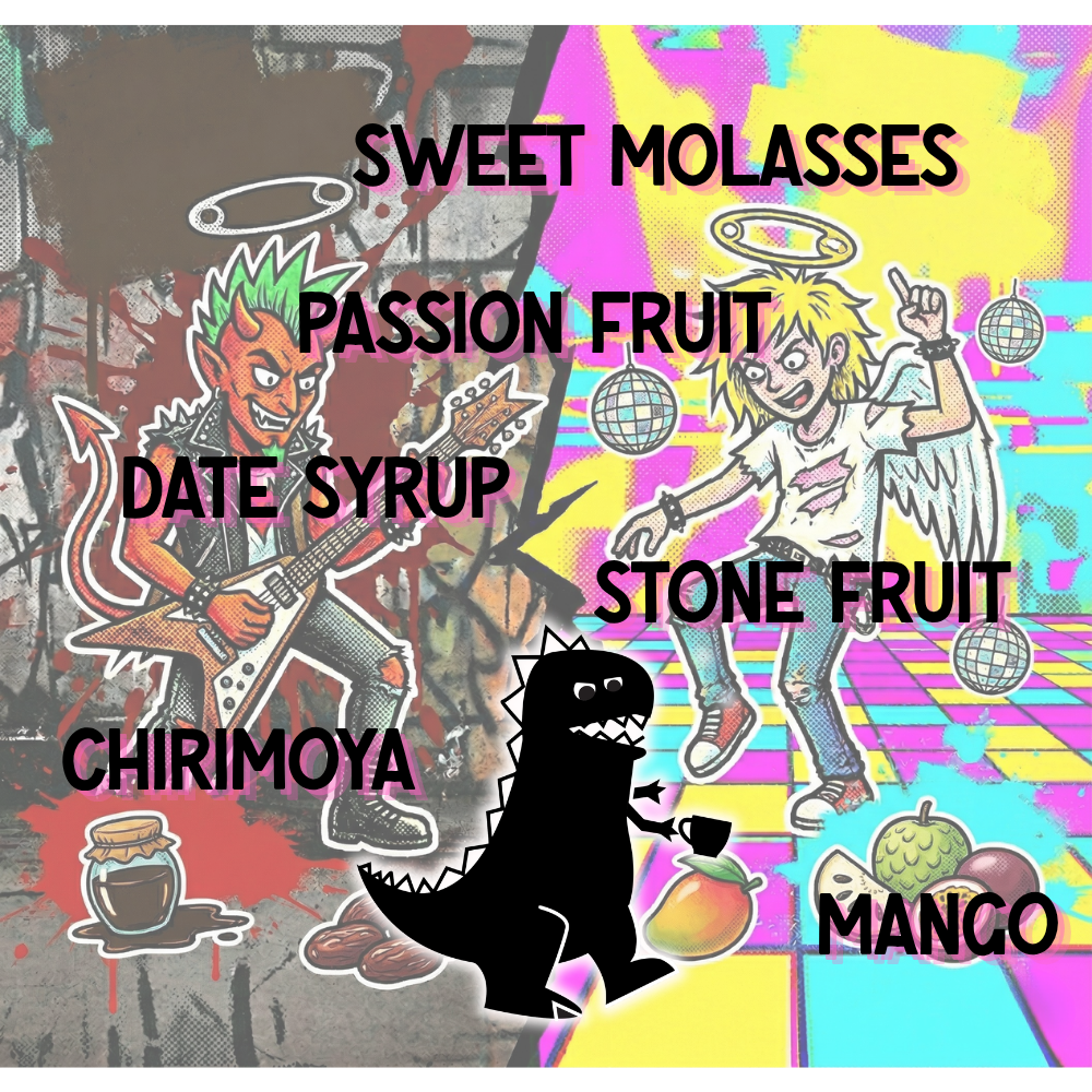 When Guatemala and Colombia have a party, you want to be on that guest list as the blending of a natural & honey process is disco! The cup starts out your journey with sweet molasses with some date syrup moving into stone fruit with a kiss of mango & chirimoya, and finishing with a sharp passion fruit acidity. We love this as a pour over, french press, drip, espresso or milk drink (as you see, our crew is divided). At the end of the day, you can't go wrong with Chulada!